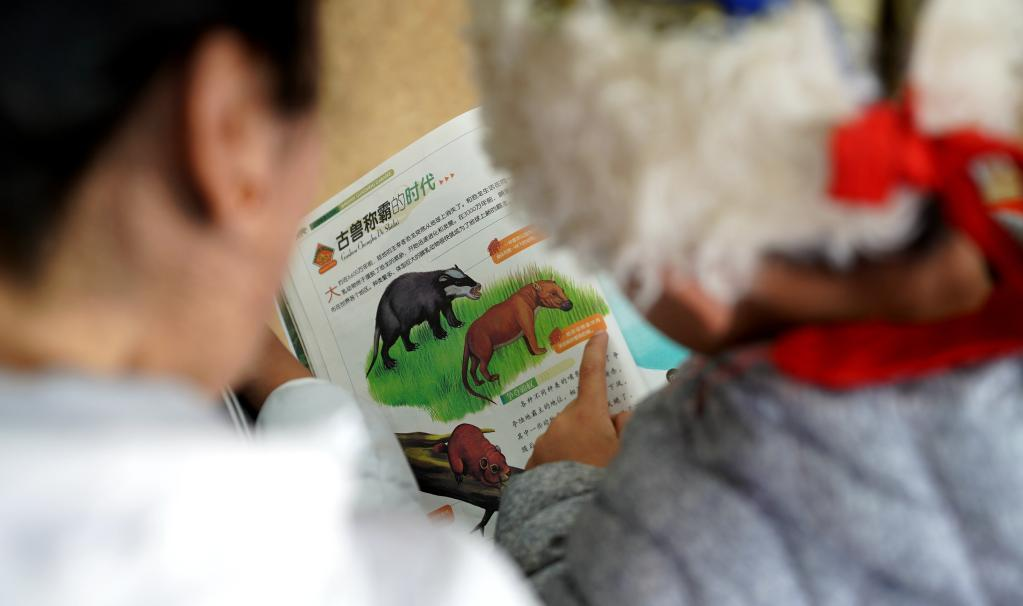 西藏自治區(qū)圖書館兒童閱覽室內,家長和孩子一起閱讀繪本(2018年2月攝)。新華社記者晉美多吉攝