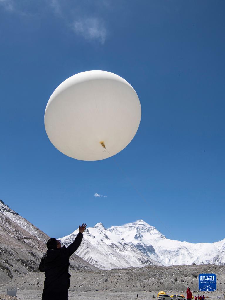 5月3日,在珠峰登山大本營,科研人員施放大氣臭氧探空氣球。新華社記者 孫非 攝