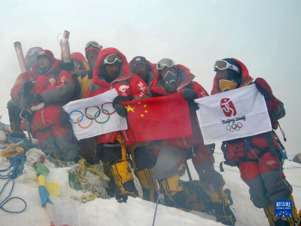 2008年5月8日,北京奧運(yùn)圣火珠峰傳遞登山隊(duì)成功登頂珠峰,德慶歐珠(右五)與隊(duì)友在峰頂展示中國國旗、奧運(yùn)五環(huán)旗和北京奧運(yùn)會(huì)會(huì)徽旗。