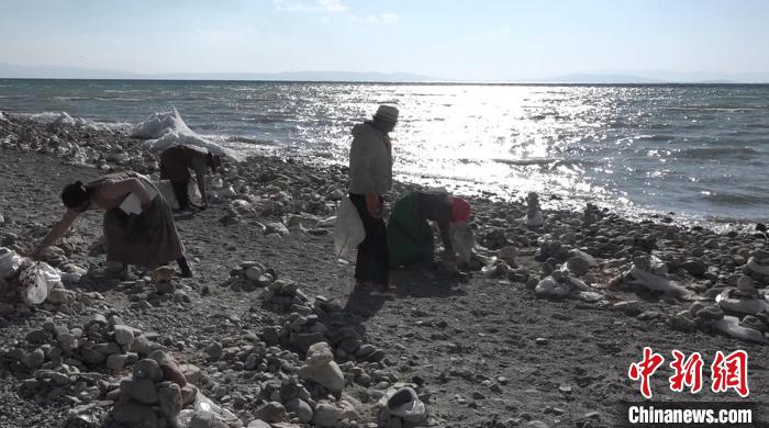 圖為牧民在瑪旁雍錯自然保護區(qū)內(nèi)撿拾垃圾。貢桑拉姆 攝