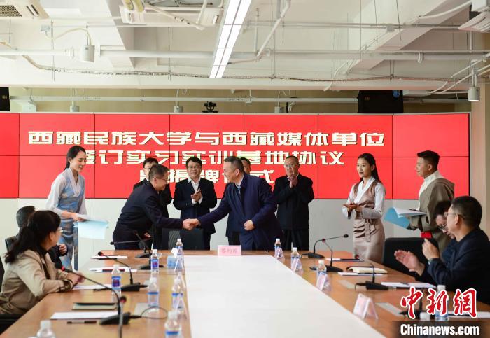 5月27日,西藏民族大學與西藏日報社、西藏廣播電視臺、人民網(wǎng)西藏頻道、中國新聞社西藏分社、中國西藏網(wǎng)西藏記者站等媒體單位簽訂實習實訓基地協(xié)議暨揭牌儀式在西藏日報舉行。