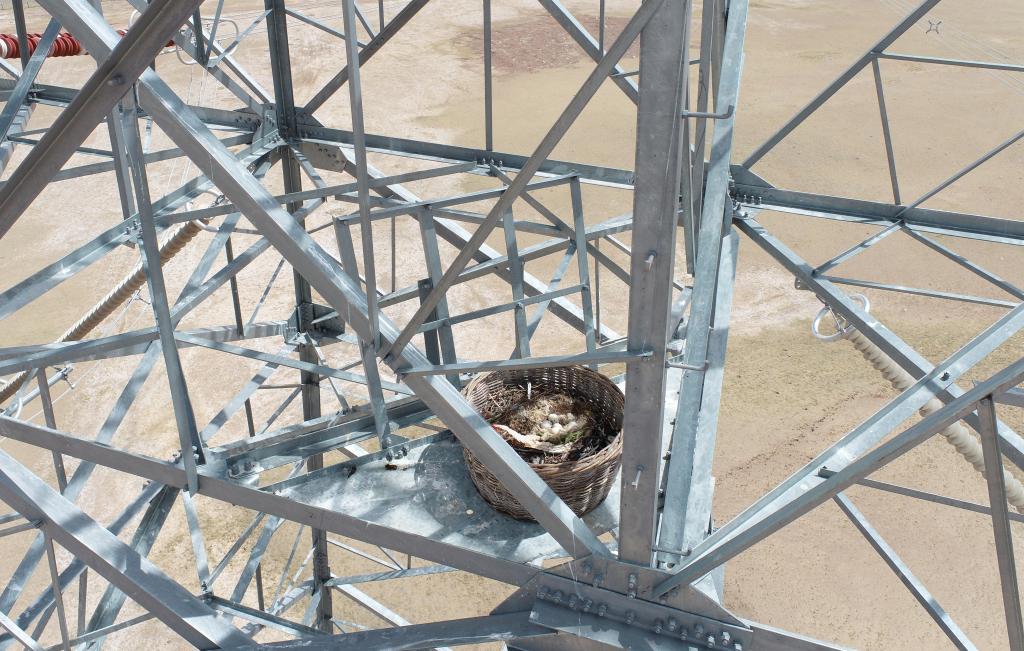 5月19日,國網(wǎng)青海超高壓公司在±400千伏柴拉直流輸電鐵塔安全區(qū)安裝的“生命鳥巢”中發(fā)現(xiàn)有鳥類筑巢痕跡。(國網(wǎng)青海超高壓公司供圖)