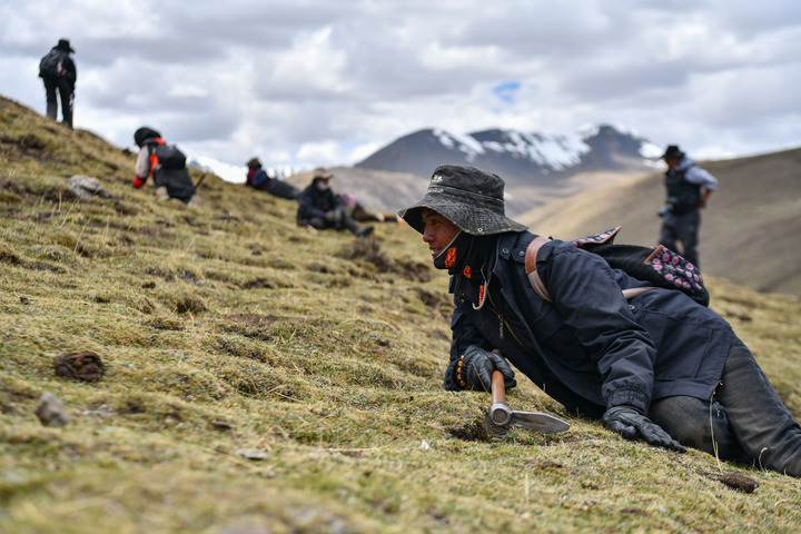 5月25日,牧民在采集蟲(chóng)草。新華社記者 晉美多吉 攝