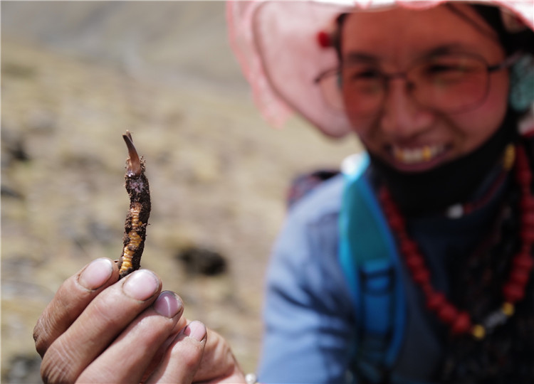 牧民其美嘎德展示剛采集到的蟲(chóng)草(5月25日攝)。新華社記者 劉潁 攝