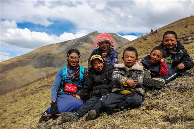 牧民其美嘎德(左一)在蟲(chóng)草采挖間隙和當(dāng)?shù)匾恍┖⒆釉谝黄穑?月25日攝)。新華社記者 姜帆 攝