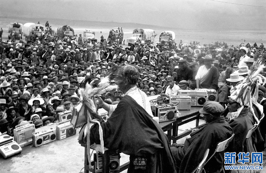 西藏那曲縣78歲的民間藝人阿達(dá)向觀眾說(shuō)唱《格薩爾王傳》。新華社記者 馬競(jìng)秋 攝(1986年1月15日發(fā))