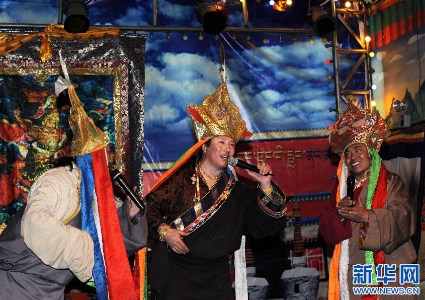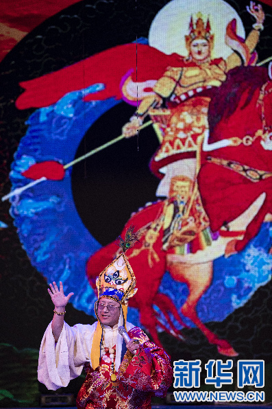 2015年12月30日晚,在拉薩舉行的西藏自治區(qū)2016年《吉祥彩虹》新年音樂(lè)會(huì)上,演員表演格薩爾說(shuō)唱。新華社記者 晉美多吉攝