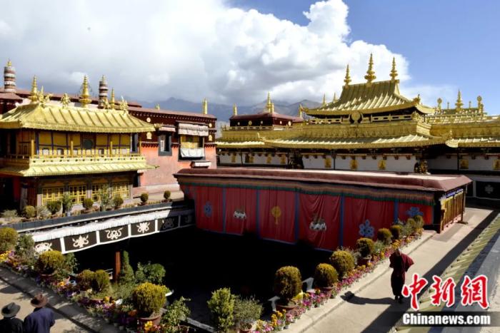 2014年10月拍攝的大昭寺金頂。大昭寺是西藏重大佛事活動(dòng)的中心,“噶廈”政府的機(jī)構(gòu)設(shè)于寺內(nèi)。許多重大的政治、宗教活動(dòng),如“金瓶掣簽”等都在這里進(jìn)行。中新社記者 李林 攝