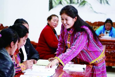 西藏墨脫縣墨脫鎮(zhèn)亞東村,上過中學的嘎迪利用晚上時間輔導(dǎo)村民學習漢字講普通話。季春紅攝/光明圖片