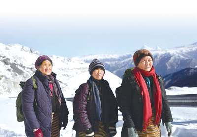 次仁曲珍(左)、普赤(中)、達(dá)吉走在前往哨所的路上。 新華社記者 覺(jué) 果攝