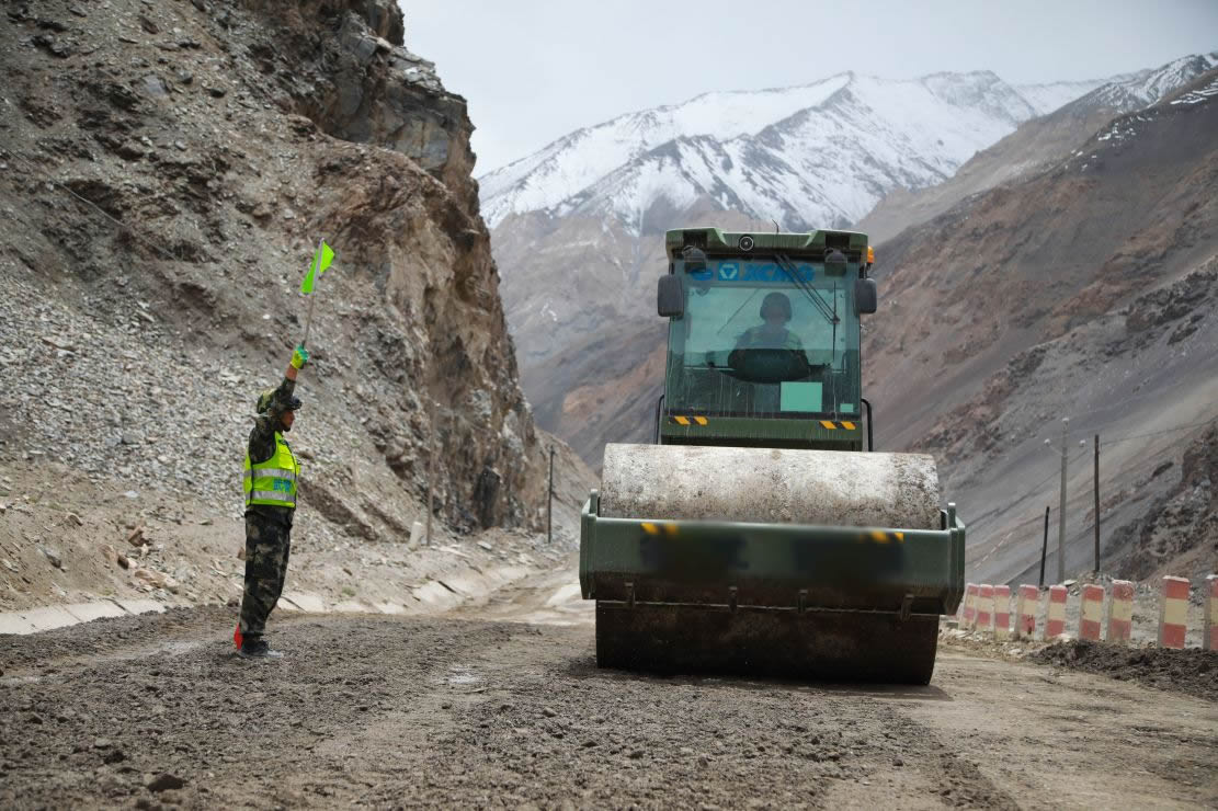 在相隔數(shù)百公里外的麻扎達坂路段,官兵們面臨的又是另一番景象,他們冒著嚴寒降雪天氣搶修沉降路基道路,現(xiàn)場分工后,隨后對兩端道路實施安全警戒,并做好過往群眾安撫解釋工作。指揮員高效指揮,操作手協(xié)同配合,安全員實時觀察山體情況,峽谷間機械馬達轟鳴、濃煙滾滾。2小時后,一段200多平方米的路基水穩(wěn)層全部鋪設完成,官兵們有序指揮車輛通行,司機分別鳴笛揮手向筑路兵致敬。