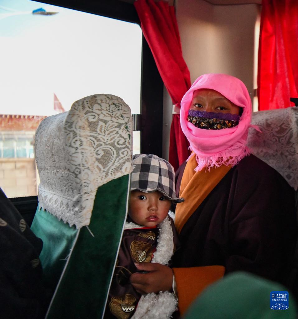 雙湖縣多瑪鄉(xiāng)果根擦曲村牧民次仁央金(右)乘坐大巴,準備前往森布日安置點(7月19日攝)。新華社記者 晉美多吉 攝