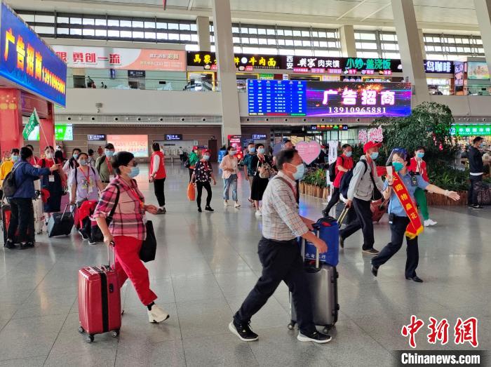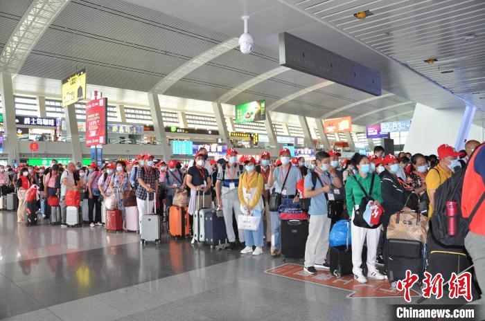 圖為西寧車站工作人員引導(dǎo)乘坐首趟暑期進(jìn)藏旅游專列的旅客進(jìn)站?;艚饌?攝