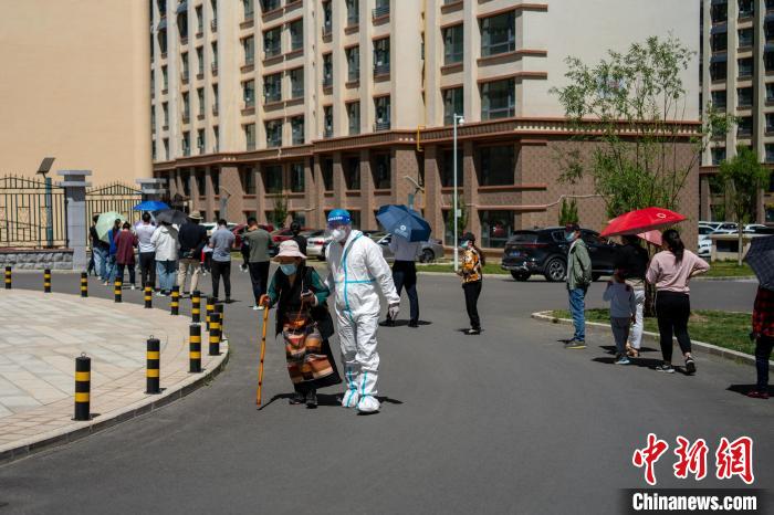 圖為8月12日,拉薩一小區(qū)內,工作人員攙扶藏族老人進行核酸檢測。 江飛波 攝
