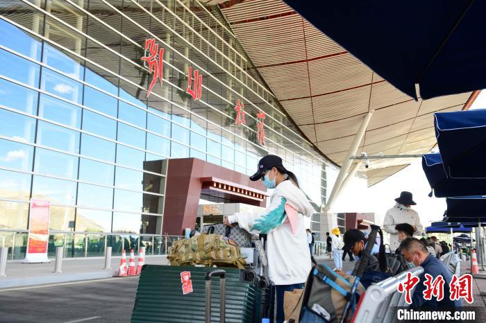 圖為8月11日,拉薩貢嘎機(jī)場(chǎng)航站樓外的旅客?!∝暩聛硭?攝