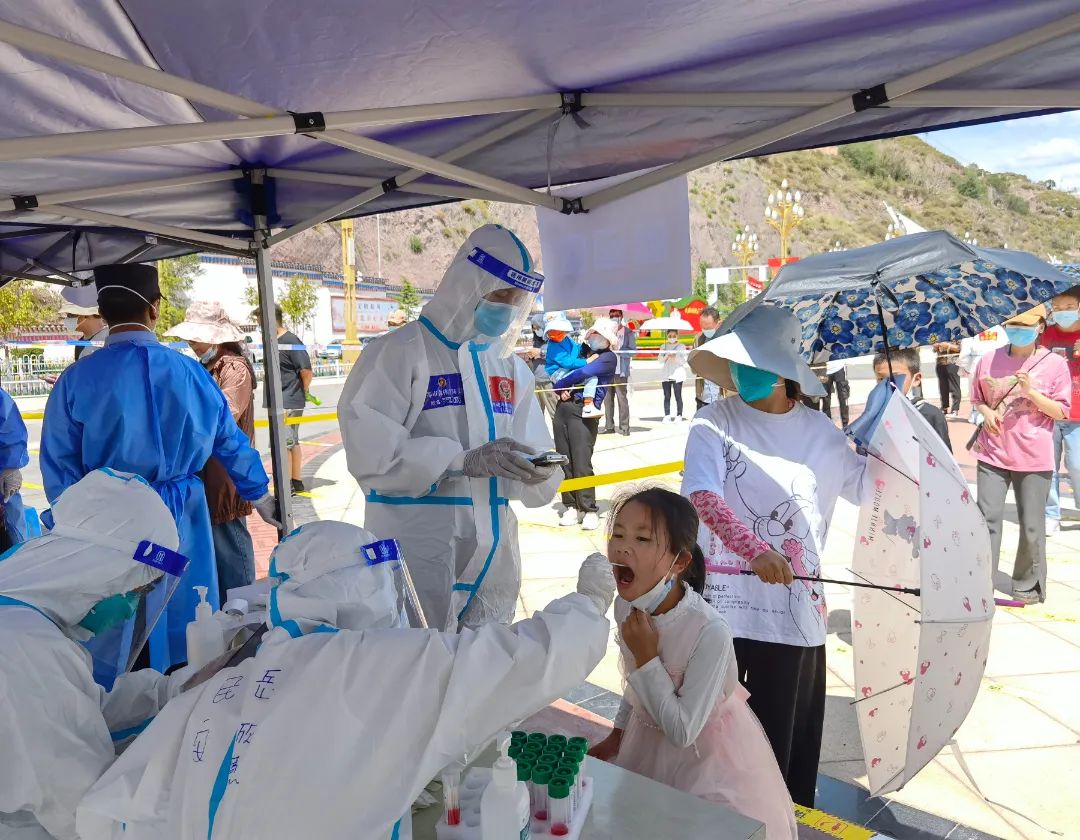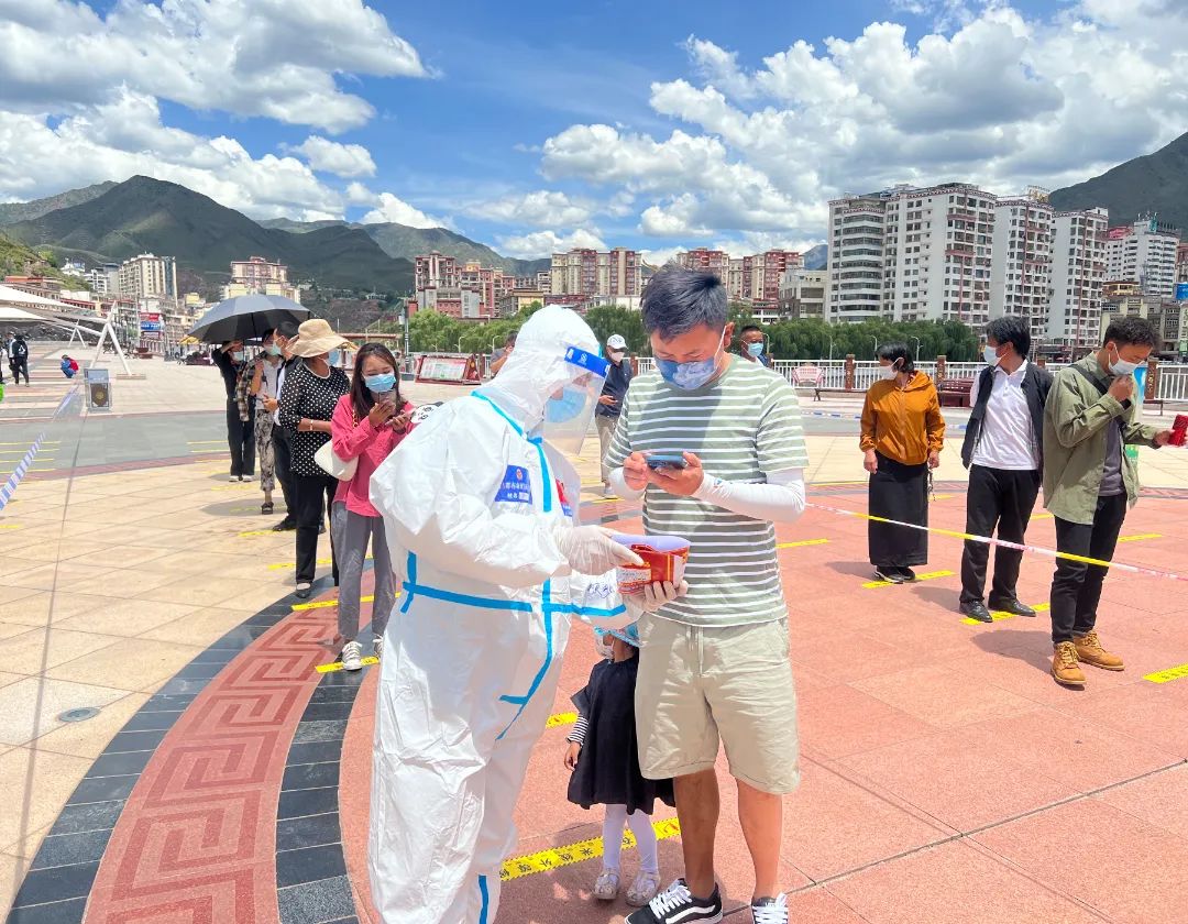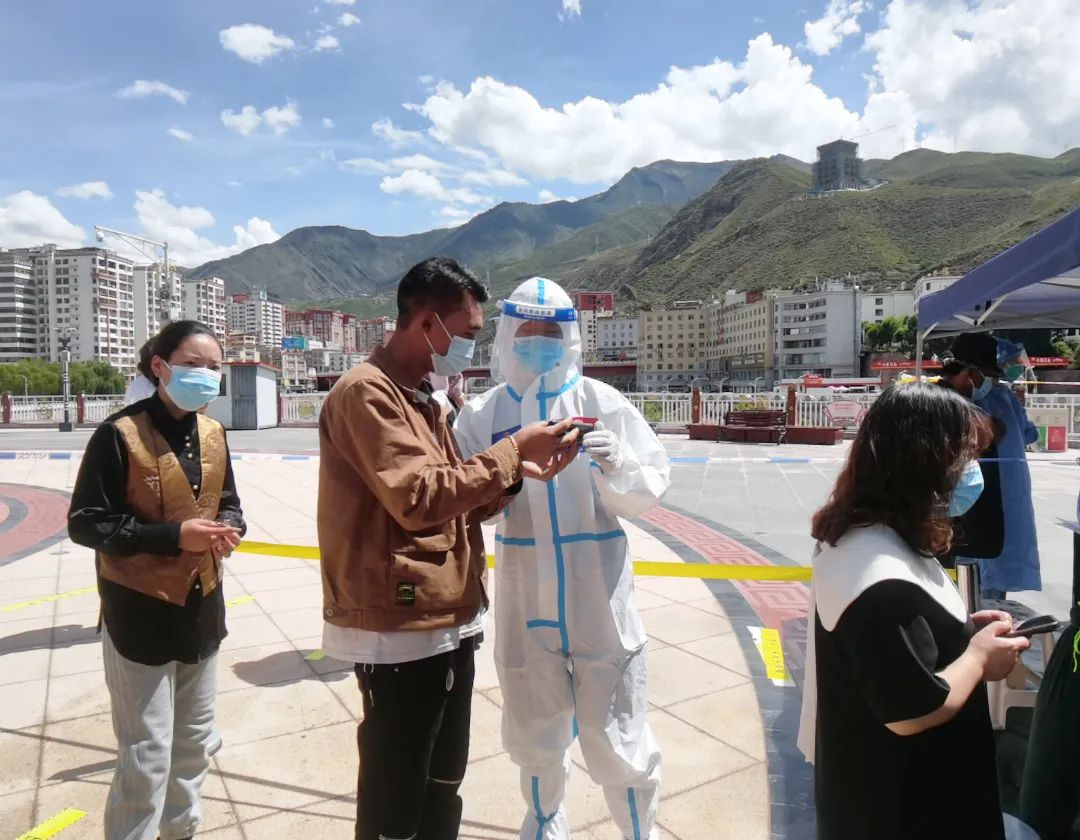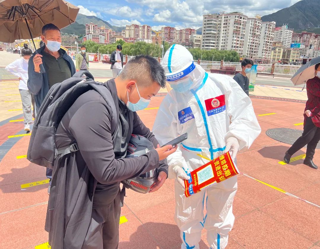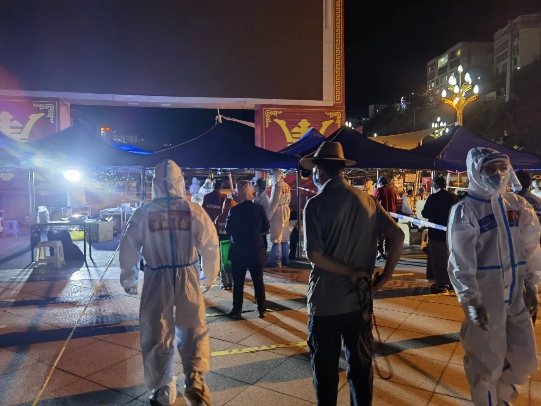 “為了您的安全,請(qǐng)保持1米以上間隔,謝謝?!蓖砩?點(diǎn)多,在茶馬廣場,支隊(duì)三級(jí)消防士張興梁,依然堅(jiān)守在抗疫一線,維持著排隊(duì)做核酸的長隊(duì)。從早上7點(diǎn)開始,張興梁和其他消防隊(duì)員已堅(jiān)守了14個(gè)多小時(shí)。“西藏晝夜溫差特大,白天防護(hù)服里面衣服都濕透了,但是到晚上這個(gè)點(diǎn)已經(jīng)干了,正好不用換衣服了?!睆埮d梁打趣的說到。