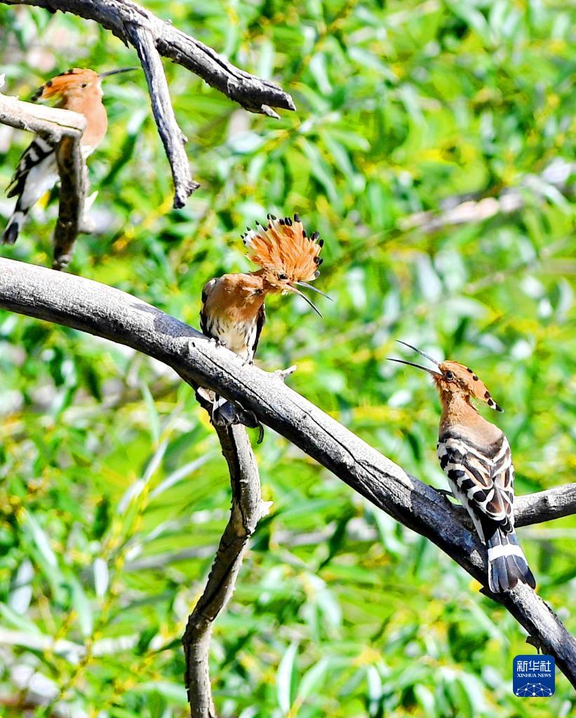 8月25日,幾只戴勝在樹上嬉戲。新華社記者 張汝鋒 攝
