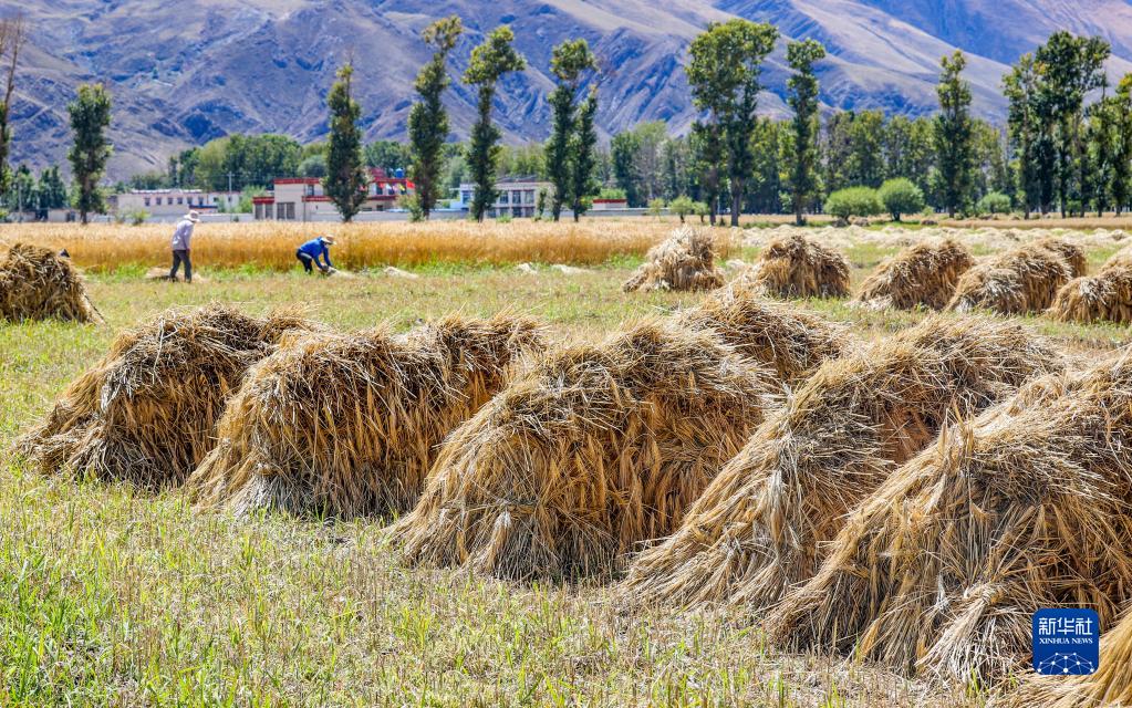 農(nóng)機(jī)合作社和收割工作隊(duì)在林周縣邊林鄉(xiāng)當(dāng)杰村玉沖組搶收小麥(9月6日攝)。新華社記者 姜帆 攝