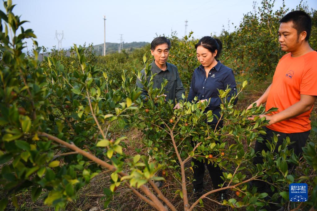 9月21日,在廣東韶關(guān)樂昌市梅花鎮(zhèn)梅花村,白拉曲珍(中)和師傅江建發(fā)(左)、同事伍國(guó)清在石漠化綜合治理的油茶種植基地查看油茶生長(zhǎng)情況。新華社記者 鄧華 攝