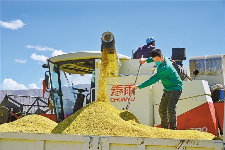 9月19日,日喀則市江孜縣熱索鄉(xiāng)努康村村民次仁多杰正在用大型收割機收獲青稞。次仁多吉 記者 扎西頓珠 攝