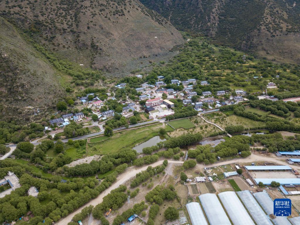 村口路邊墻壁上“綠水青山就是金山銀山”紅色大字十分醒目。再往里走,道路平坦整潔,四處花紅葉綠。藍天白云下,一棟棟藏式民居掩映于蒼翠群山間,漫山遍野的野生桃林令人心曠神怡。