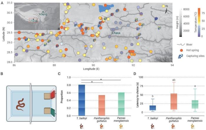 中國科研人員結(jié)合野外調(diào)查和文獻(xiàn)調(diào)研,整理了高原地?zé)豳Y源以及溫泉蛇的分布信息,發(fā)現(xiàn)溫泉蛇高度偏好溫泉生境。通過趨熱行為學(xué)實(shí)驗(yàn)證明,相較于另外兩種低海拔蛇類,溫泉蛇能夠更快速地定位到高溫區(qū)域,且對高溫區(qū)表現(xiàn)出強(qiáng)烈的偏好,提示溫泉蛇具有高效的溫度感知能力。