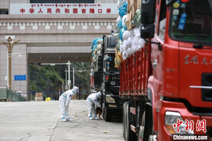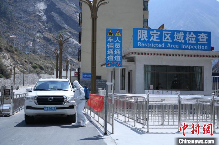 吉隆出入境邊防檢查站移民管理警察對(duì)外出口岸限定區(qū)域車(chē)輛進(jìn)行消毒?!⌒じ毁F 攝