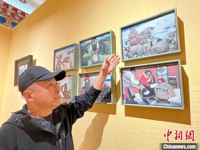 策展人李亞男向中新網(wǎng)記者介紹,崔曉曉首次到西藏那曲便結(jié)識(shí)了一位當(dāng)?shù)嘏笥选麑⑦@位藏族青年放牧、添置汽車、蓋新房等畫面用畫筆記錄了下來(lái),在本次展覽中展出。