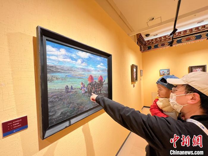 帶兒子一同前來(lái)參觀的向先生曾于2013年夏季到西藏旅游。他告訴記者,畫中的風(fēng)景、建筑和服飾非常寫實(shí);有關(guān)冬季的畫作彌補(bǔ)了他未見西藏冬日美景的遺憾。