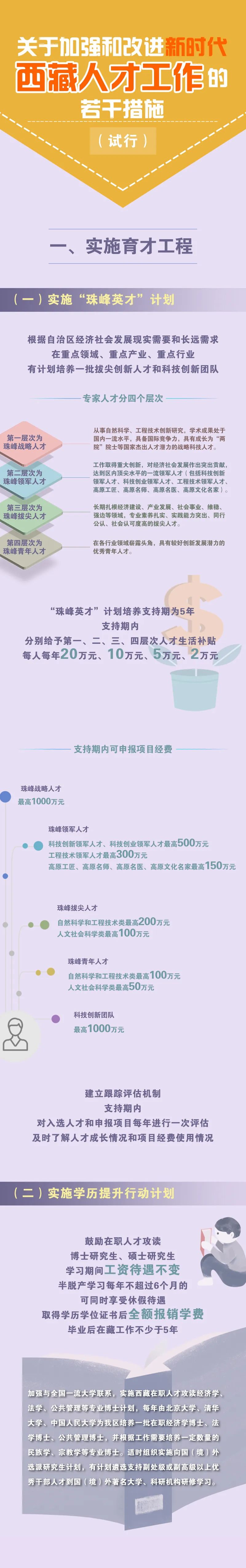 實(shí)施“珠峰英才”計(jì)劃,每年遴選支持一批珠峰戰(zhàn)略人才、珠峰領(lǐng)軍人才、珠峰拔尖人才、珠峰青年人才和科技創(chuàng)新團(tuán)隊(duì),在5年支持期內(nèi)給予生活補(bǔ)貼和項(xiàng)目經(jīng)費(fèi)支持,項(xiàng)目經(jīng)費(fèi)最高可申請1000萬元。實(shí)施學(xué)歷提升行動,支持在職人才攻讀研究生,并協(xié)調(diào)全國頂尖高校為西藏定向培養(yǎng)博士研究生。