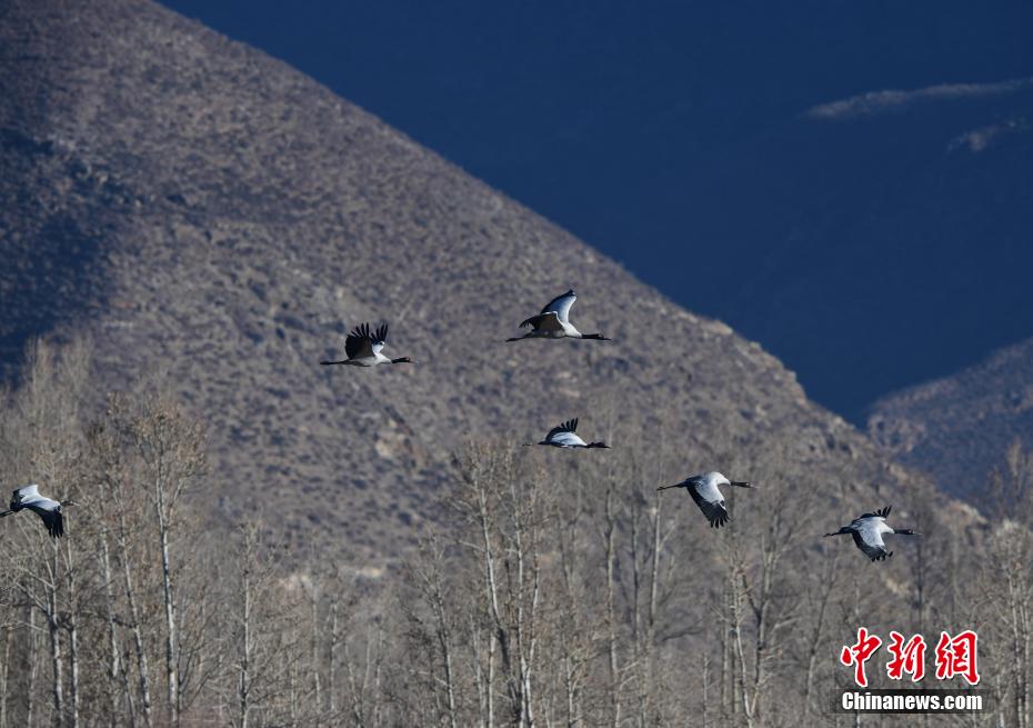 每年的10月底,成群的黑頸鶴飛到西藏拉薩市林周縣越冬,在拉薩市林周縣周邊的湖泊濕地度過(guò)5個(gè)月的“閑云野鶴”生活,次年三四月份再飛向藏北草原繁殖。黑頸鶴是世界上唯一一種高原鶴類(lèi)。具有足長(zhǎng)、喙長(zhǎng)、頸長(zhǎng)的典型涉禽類(lèi)特征,適合在沼澤地里行走。黑頸鶴的頸、尾為黑色,體羽為灰白色。黑頸鶴是國(guó)家一級(jí)保護(hù)動(dòng)物。目前,每年到林周縣越冬的黑頸鶴已達(dá)2000只左右。圖為黑頸鶴在林周境內(nèi)的農(nóng)田上空飛翔。 貢嘎來(lái)松 攝