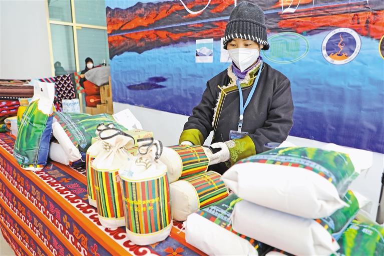 在日土縣展銷(xiāo)區(qū),工作人員在擺放特色產(chǎn)品。記者 永青 攝