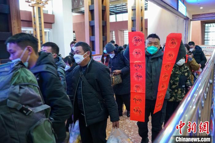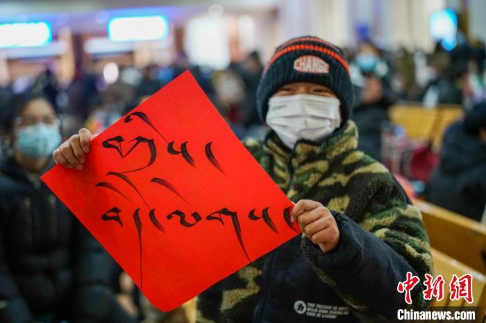 圖為春運首日,拉薩火車站一旅客獲得車站送的藏式春聯(lián),上面書寫的是藏語“扎西德勒 吉祥如意”。 江飛波 攝