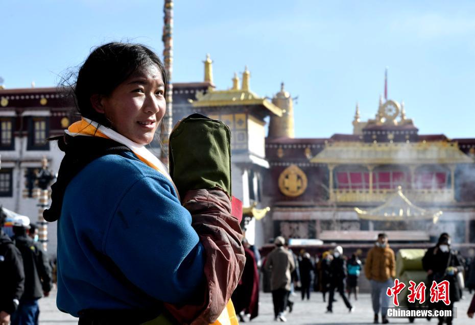 1月12日,西藏拉薩,來自西藏那曲的吉卓瑪歷經(jīng)31天的磕長(zhǎng)頭,順利抵達(dá)拉薩大昭寺。 李林 攝