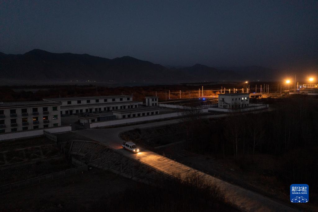 羅布和同事駕車駛出拉林鐵路扎囊工電綜合工區(qū),趕往鋼軌探傷作業(yè)點(1月12日攝,無人機(jī)照片)。新華社記者 孫非 攝