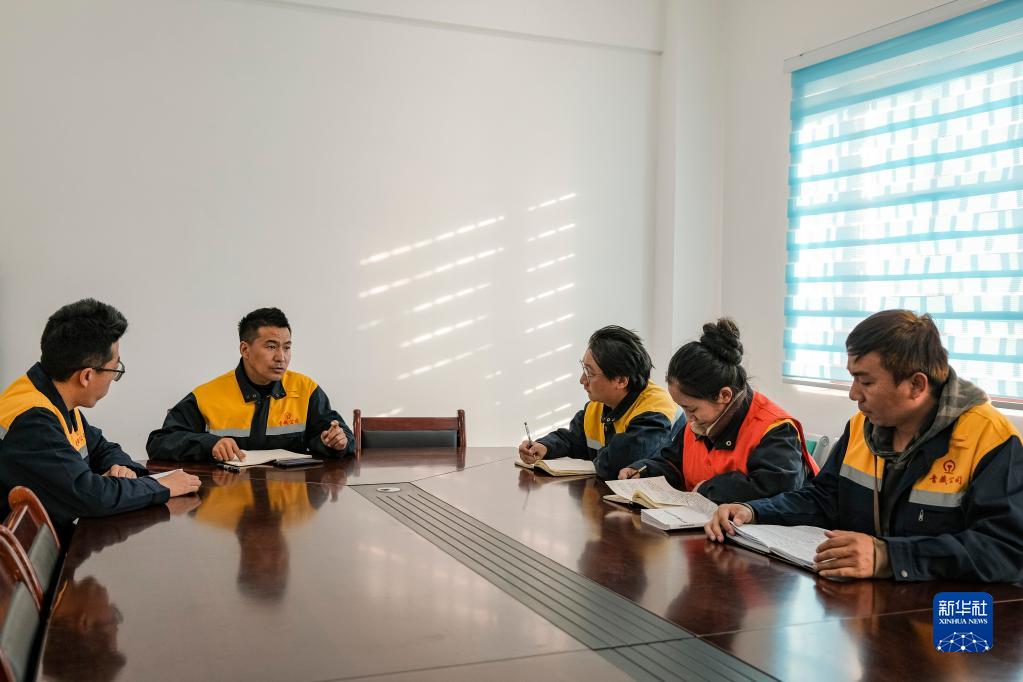羅布(左二)在班前會上給鋼軌探傷隊員進(jìn)行任務(wù)部署和安全警示(1月12日攝)。新華社記者 孫非 攝