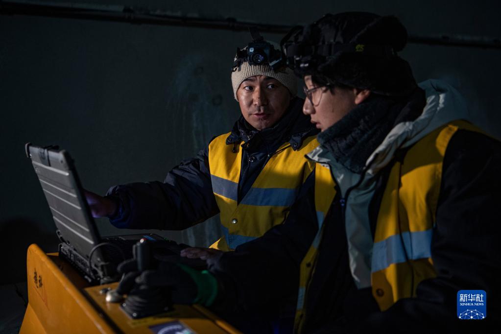 羅布(左)和同事對鋼軌的疑似傷損波形進(jìn)行確認(rèn)(1月12日攝)。新華社記者 孫非 攝