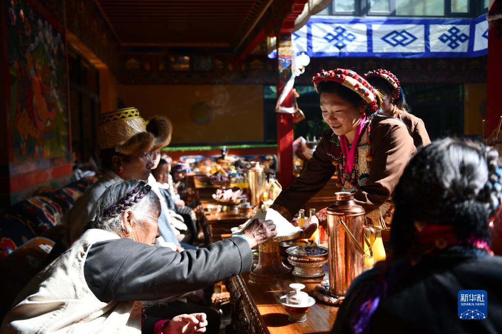 在位于西藏日喀則拉孜縣扎西宗鄉(xiāng)雜村的家中,次旦老人一臉幸福的微笑,家中小輩正輪流上前和她行碰頭禮。