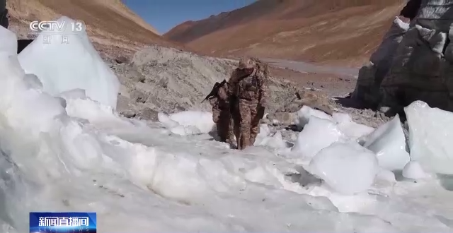 經(jīng)過一個多小時的車行顛簸,巡邏分隊到達了車行道路的終點,接下來的徒步巡邏才是此次巡邏挑戰(zhàn)的開始。翻越海拔6000米的冰川,這對于常年駐守的官兵們來說也是極大的挑戰(zhàn),行進途中稍不注意就會摔倒在地,即便是經(jīng)驗豐富的老兵走在上面也時常手腳并用才能前行。