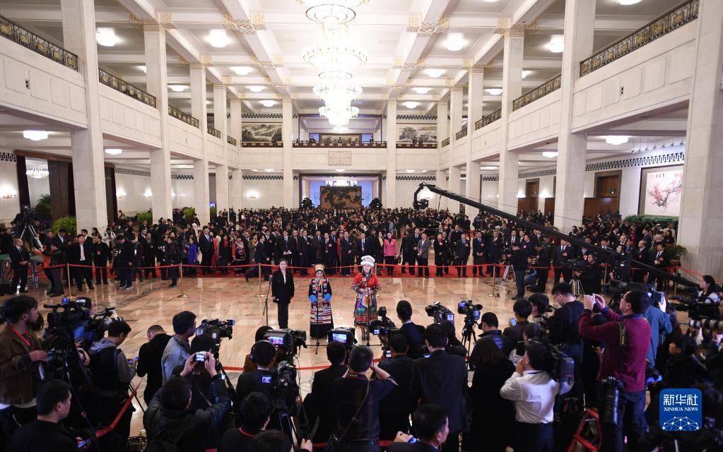 2018年3月11日,十三屆全國人大一次會(huì)議在北京人民大會(huì)堂舉行第三次全體會(huì)議,全國人大代表卓嘎(中)在“代表通道”接受采訪。新華社記者 王建華 攝