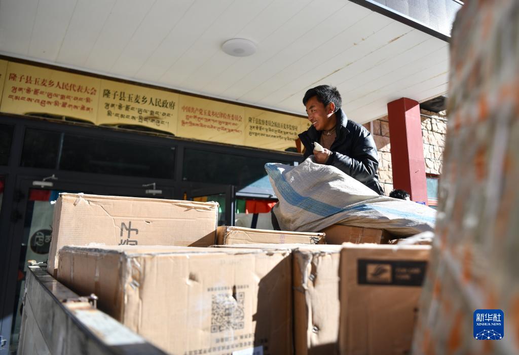 玉麥鄉(xiāng)郵遞員在搬運(yùn)剛剛抵達(dá)玉麥的快遞包裹(2023年1月8日攝)。新華社記者 晉美多吉 攝