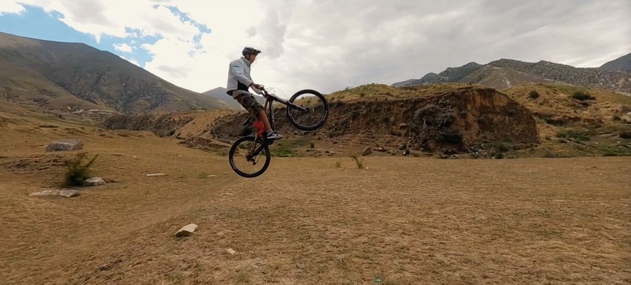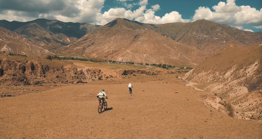 乘著風,沿著山脊速降,自行車始終徘徊在失控邊緣,旦增吉米需要不斷調整、控制。