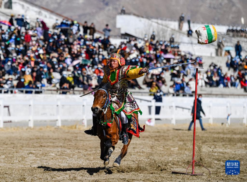 2月23日,在拉薩賽馬場舉辦馬術(shù)表演已成為當(dāng)?shù)貞c祝新年的傳統(tǒng),深受廣大群眾喜愛。騎手們英姿颯爽,為觀眾們帶來騎馬拾哈達(dá)、騎馬射箭等精彩表演。
