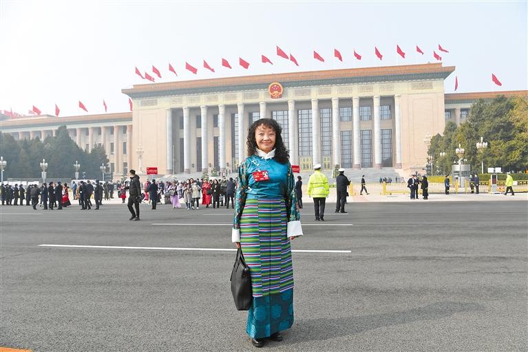 圖為全國(guó)人大代表白瑪措在人民大會(huì)堂前拍照留念。 記者 李洲 攝
