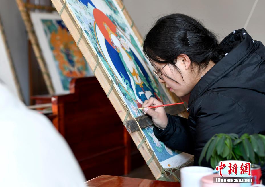 圖為3月8日,西藏拉薩,南草吉正在繪制唐卡。