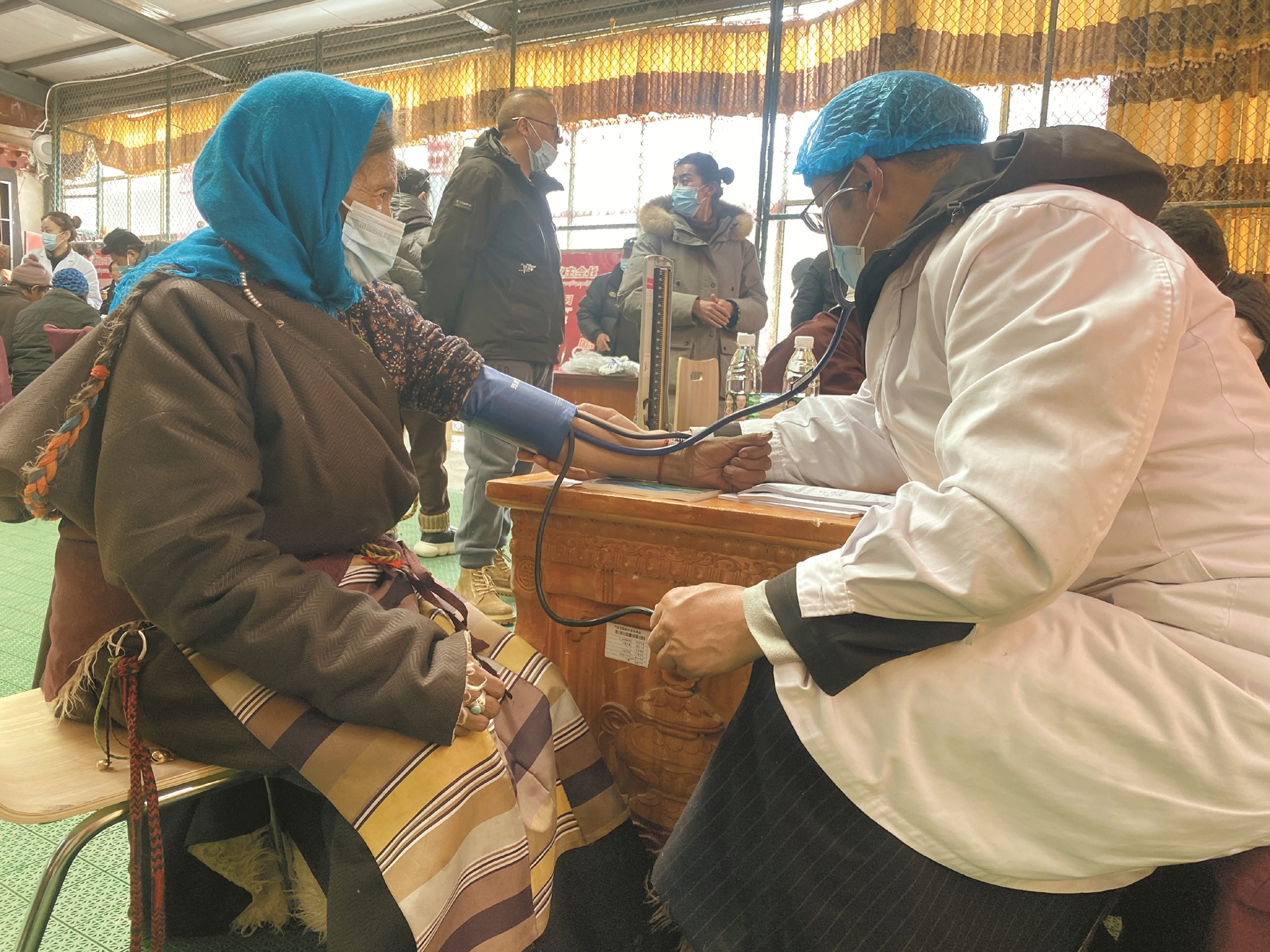 當(dāng)日,納木湖鄉(xiāng)綜合文化站內(nèi)人頭攢動,當(dāng)?shù)啬撩袢罕姷弥獊碜岳_的醫(yī)療專家前來義診,都早早地來到文化站內(nèi)等候。在義診現(xiàn)場,來自市人民醫(yī)院北京“組團式”援藏醫(yī)療隊、城關(guān)區(qū)平衡針灸愛心志愿服務(wù)隊和利眾醫(yī)院的專家醫(yī)師們?yōu)榍皝砭驮\的群眾進行疾病篩查、心肺聽診、測量血壓、針灸等檢查治療。診療中,醫(yī)生們仔細詢問群眾的過往病史和身體狀況,耐心細致地提出治療建議,講解注意事項并免費為群眾發(fā)放所需藥物。
