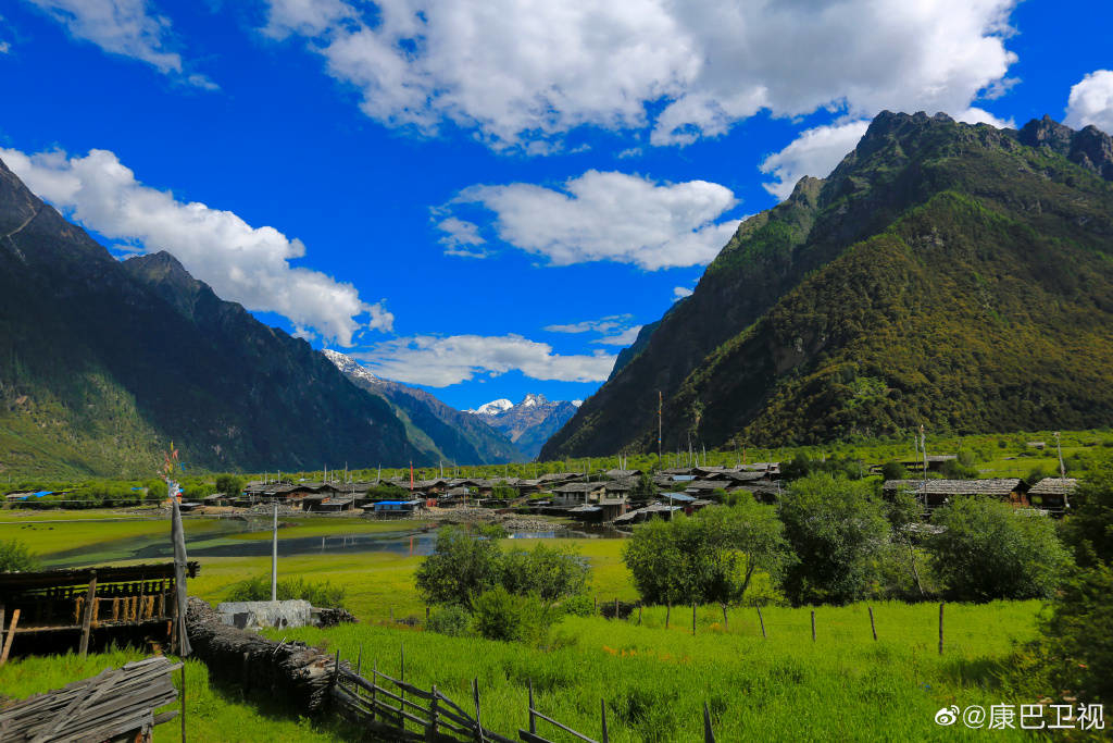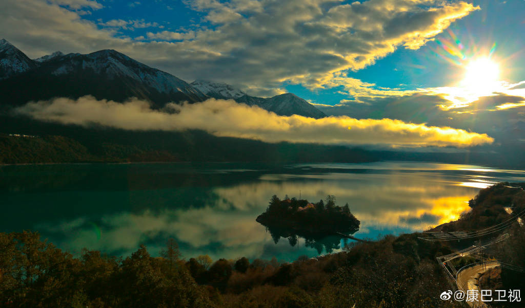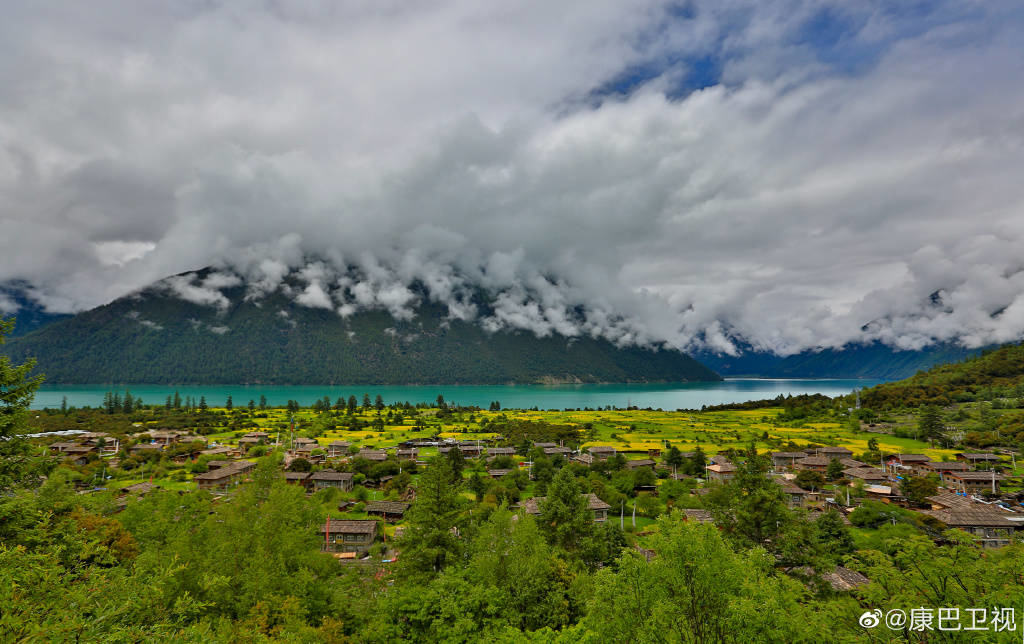 湖邊房舍錯落,一湖如帶,濕地從湖邊村緩緩延展至湖畔,而海拔6300多米的杰青那拉嘎布雪山,照映在湖面,飄渺的云霧如從天上飄下……宛如一座世外桃源小仙境。