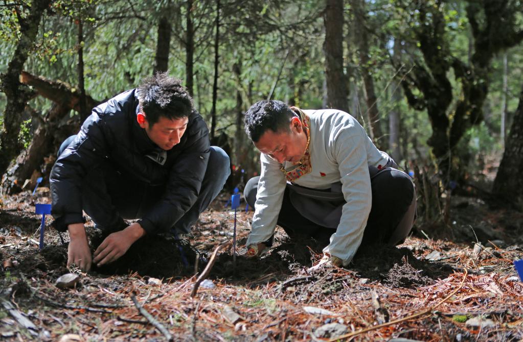 巴桑頓珠(右)與村民在天麻種植園里進(jìn)行日常管護(hù)(3月24日攝)。新華社記者邵澤東 攝