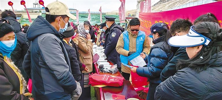 山南市錯那縣“鑄牢中華民族共同體意識 慶祝西藏百萬農奴解放紀念日”活動現(xiàn)場,各宣傳點給群眾發(fā)放宣傳資料。記者 旦增蘭澤 攝
