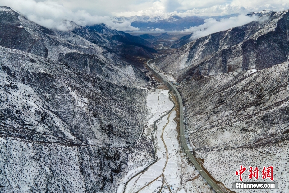 3月28日,西藏S5線拉薩至澤當快速通道項目控制性工程圭嘎拉隧道左洞實現(xiàn)貫通。圖為西藏S5線拉薩至澤當快速通道項目拉薩達孜段。(無人機畫面)